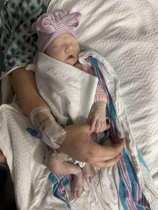 On September 27, 2022, I was admitted to L&D for low amniotic fluid and possible pre-eclampsia. On October 1, 2022, I was diagnosed with pre-eclampsia with severe features, since I had fluid on my lungs. Catherine was born via emergency c-section at 5:33pm at 32 weeks and rushed to the NICU while I was sent to the ICU on a ventilator. I didn't get to meet her until the next day.